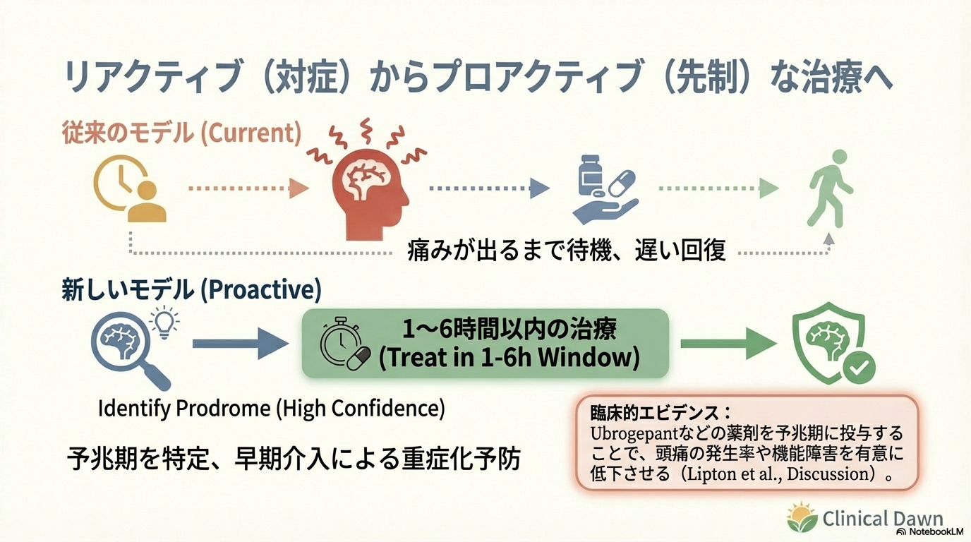 そこで研究者たちが注目しているのが、「予兆の段階でゲパントを服用する」というアプローチです。海外では、この方法によって強い頭痛への移行を抑えられる可能性を示した臨床試験の結果が報告されており、片頭痛治療の新たな選択肢として関心が高まっています。