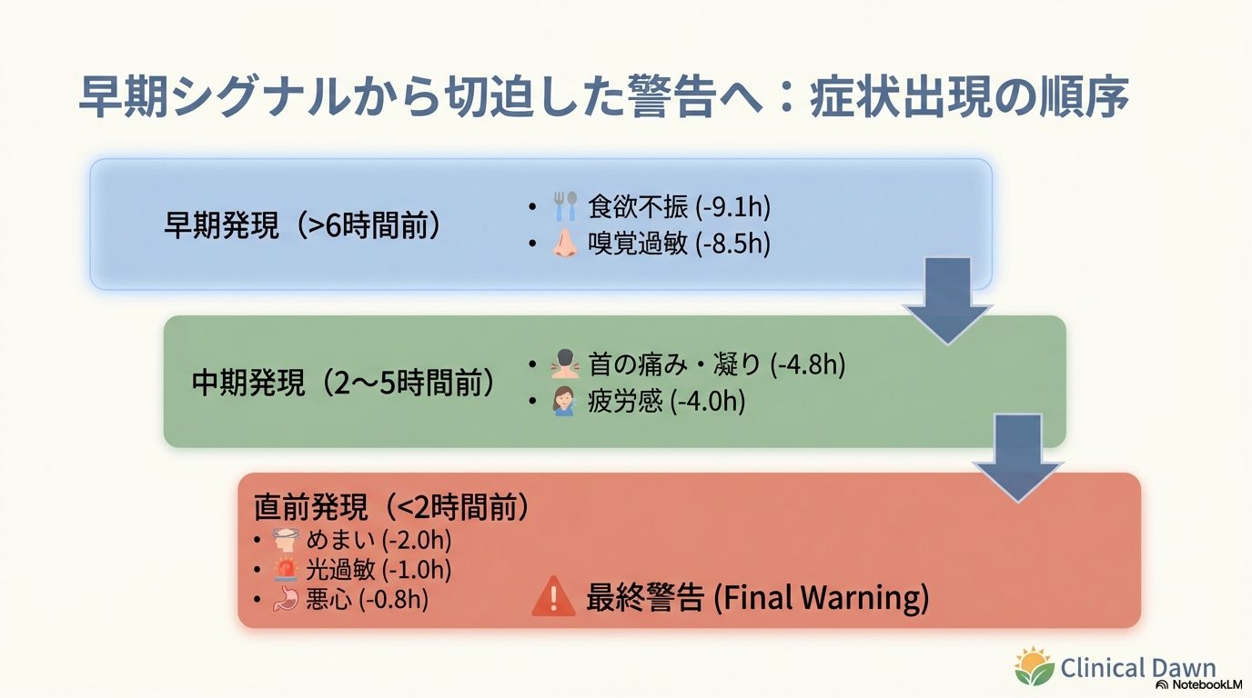 片頭痛は、突然頭が痛くなるだけの病気ではありません。実は多くの患者さんで、頭痛が始まる数時間前から「なんとなくいつもと違う」と感じるサインが現れることが知られています。これを「予兆(前駆症状)」と呼びます。