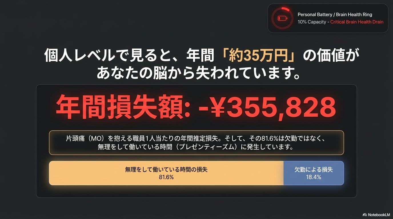 欠勤(仕事を休む)よりも、実はこのプレゼンティーイズムによる損失のほうがはるかに大きいことが明らかになっています。頭痛発作中の作業能率は、片頭痛で最大 50% 近く低下するとも報告されており、頭痛に伴う経済損失の約 80% 以上が、休んだことによるものではなく、出勤しながらも能率が落ちていることによって生じているとされています。