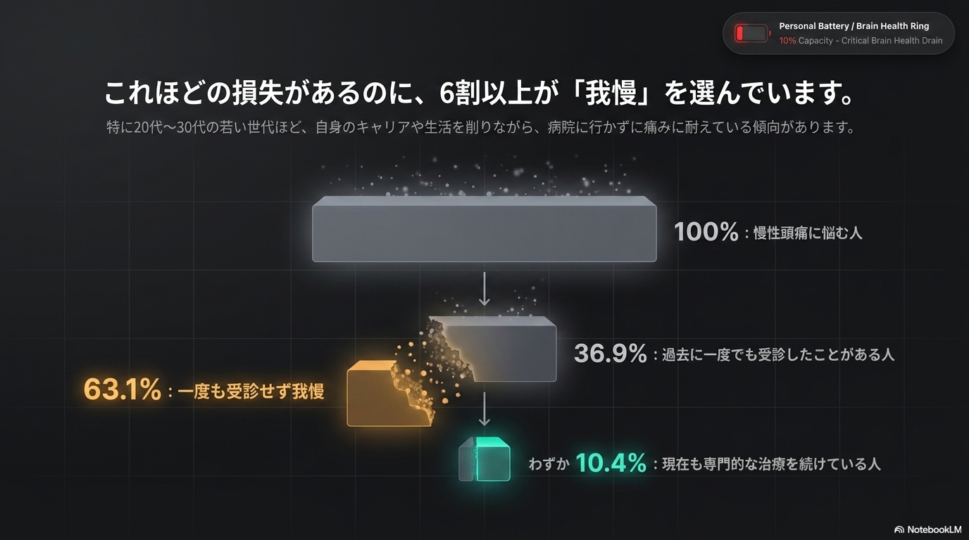 市販の鎮痛薬は、急場をしのぐためには一定の効果があります。しかし、慢性的な頭痛をもつ方の多くが市販の鎮痛薬に頼り続けているのが現状です。国内の調査では、慢性頭痛をもつ方の 60〜80% が市販薬のみで対処しており、専門医を受診して治療を受けているのはごく一部にとどまります。