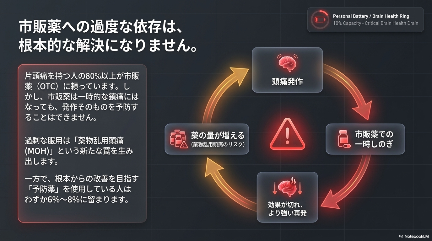 ここで注意していただきたいのが、薬剤の使用過多による頭痛、いわゆる薬物乱用頭痛(MOH:Medication Overuse Headache)です。これは、痛みを抑えるために飲み続けていた薬そのものが、頭痛をより慢性化・悪化させてしまうという状態です。