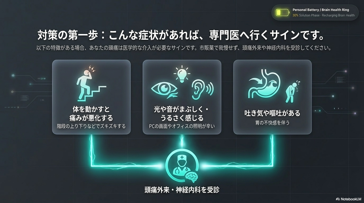 職場での成果が思うように上がらない、家事や育児に集中できない・・・こうした積み重ねは、長い目で見れば自分自身の評価や生活の質、ひいては収入にもじわじわと影響します。「頭痛ぐらいで」と思わず、正面から向き合うことが大切です。